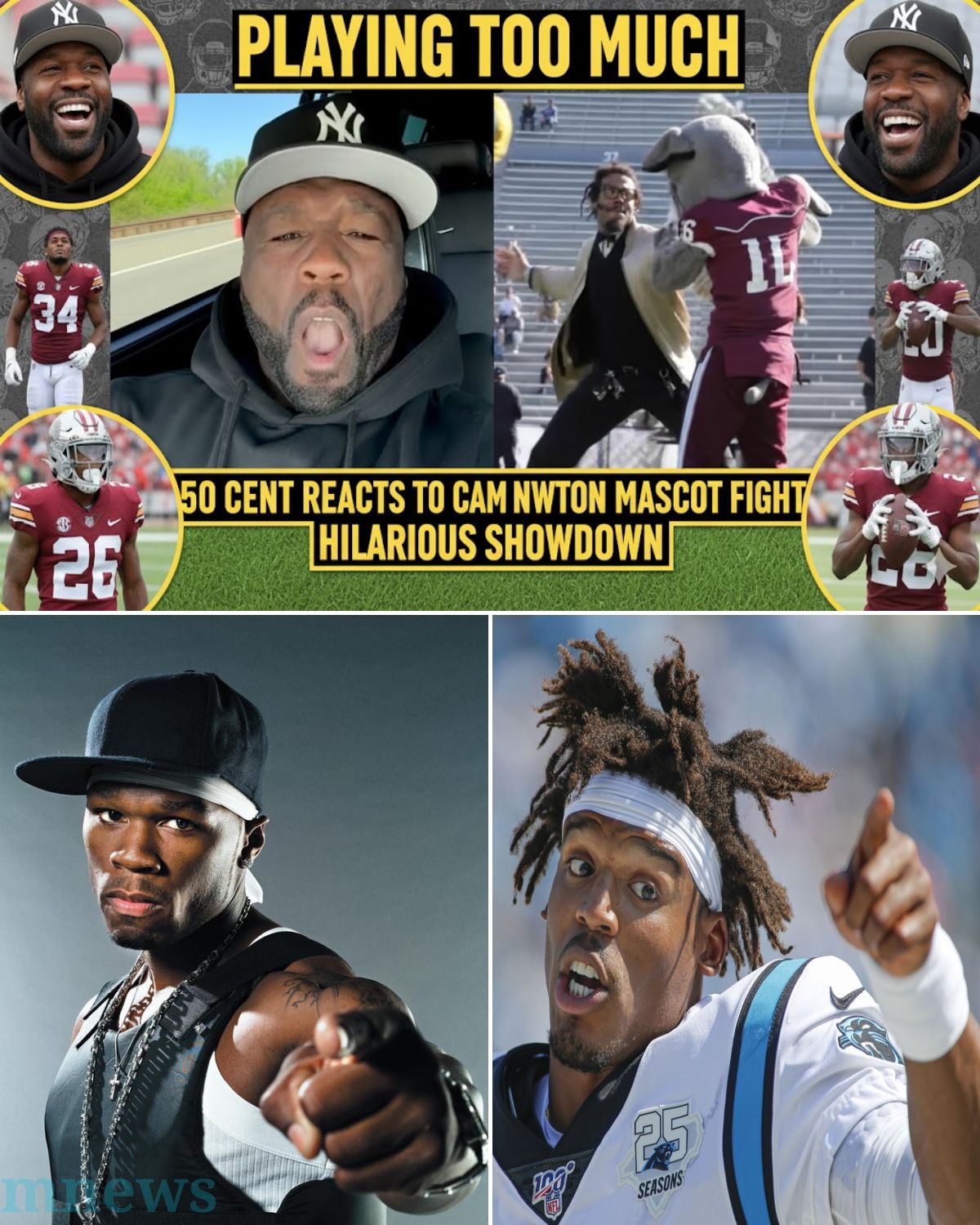 Title: “50 Cent Calls Out Cam Newton Over Mascot Brawl: ‘Stop Playing!'”